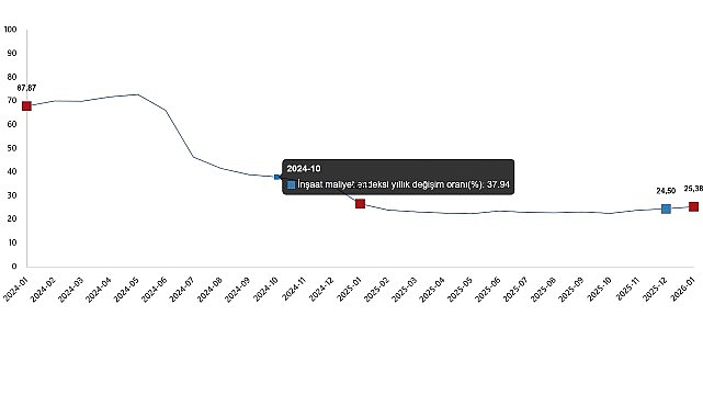 İnşaat maliyet endeksi, 2026 yılı Ocak ayında bir önceki aya göre %9,87 arttı, bir önceki yılın aynı ayına göre %25,38 arttı. Bir önceki aya göre malzeme endeksi %3,52 arttı, işçilik endeksi %21,84 arttı. Ayrıca bir önceki yılın aynı ayına göre malzeme endeksi %23,32 arttı, işçilik endeksi %28,83 arttı.
